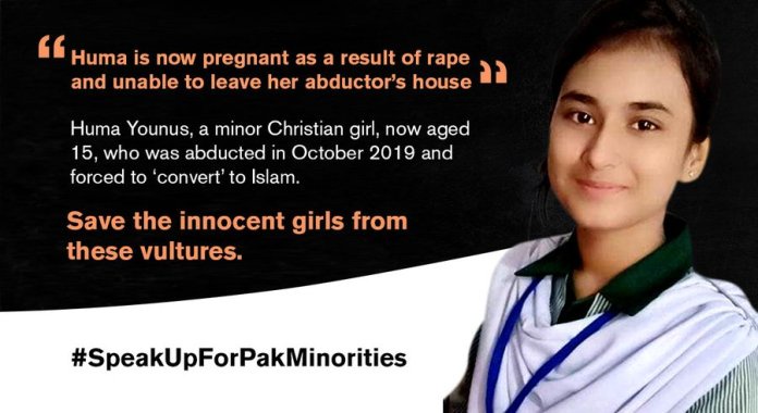 हुमा यूनुस का 14 साल की उम्र में पाकिस्तान के सिंध प्रान्त में अक्टूबर 2019 में अब्दुल जब्बार ने अपहरण कर लिया गया था। उससे जबरन इस्लाम कबूल करवाया गया। तभी से वह कैद में है। अपहरणकर्ता द्वारा बार-बार बलात्कार के बाद हुमा अब गर्भवती है। अपहरणकर्ता उसके परिवार को धमकियाँ दे रहे हैं।