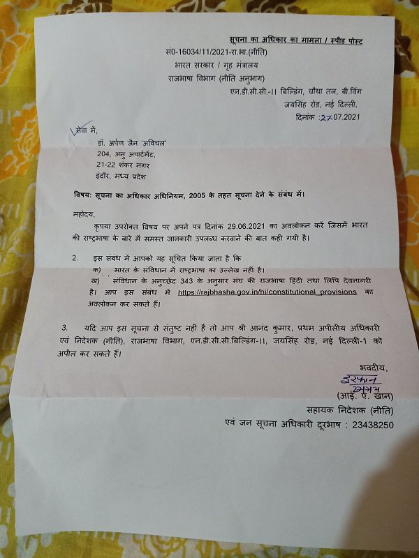 मातृभाषा उन्नयन संस्थान के संस्थापक अध्यक्ष डॉ. अर्पण जैन ‘अविचल’ को सूचना के अधिकार के तहत भारत सरकार के गृह मंत्रालय के राजभाषा विभाग द्वारा मिली सूचना के अनुसार भारत के संविधान में राष्ट्रभाषा का कोई उल्लेख नहीं है और संविधान के अनुच्छेद 343 के तहत संघ की राजभाषा हिन्दी यानी राजकाज की भाषा मात्र है और लिपि देवनागरी है।