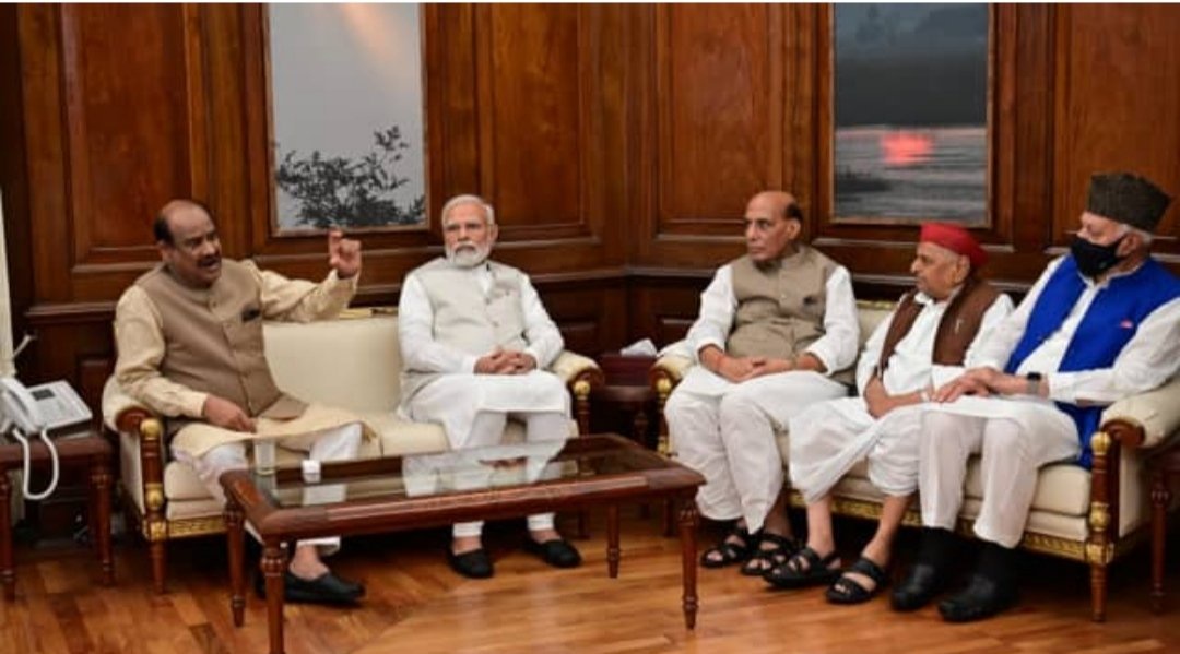 पीएम नरेंद्र मोदी ने गुरुवार को दिल्ली में समाजवादी पार्टी के संरक्षक मुलायम सिंह यादव से मुलाकात की। इसके अलावा नेशनल कॉन्फ्रेंस के नेता फारूक अब्दुल्ला भी इस दौरान मौजूद थे। संसद का बजट सत्र समाप्त होने के बाद लोकसभा स्पीकर ओम बिरला की मौजूदगी में पीएम नरेंद्र मोदी ने विपक्ष के इन प्रमुख नेताओं से मुलाकात की। यही नहीं रक्षा मंत्री राजनाथ सिंह भी मौके पर मौजूद थे। इस दौरान सभी नेता हल्के अंदाज में नजर आए और हंसी मजाक करते हुए दिखाई दिए। सपा नेता मुलायम सिंह यादव से पीएम नरेंद्र मोदी अकसर बेहद सद्भाव से मिलते रहे हैं।